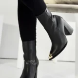 100% genuine leather ankle boots with a 9.5 cm high heel and stainless steel toe cap. Elegant, modern, and bold.